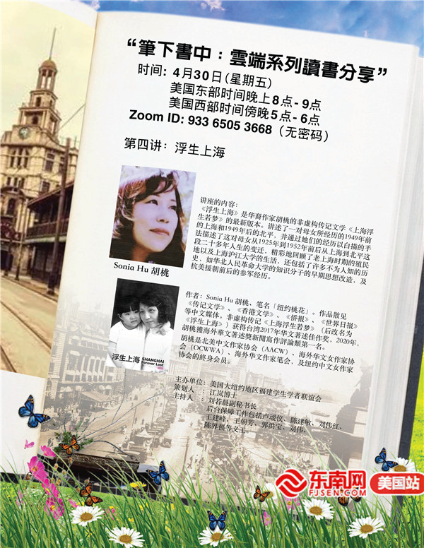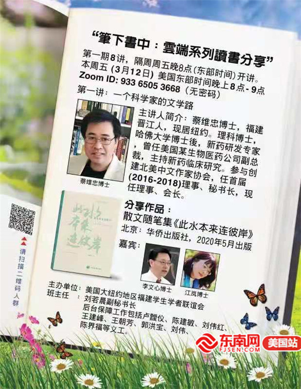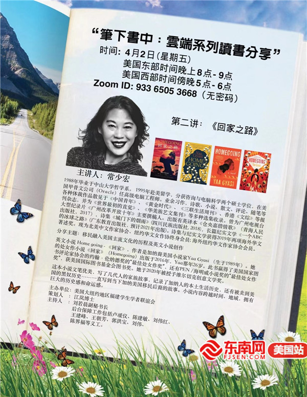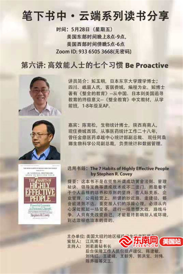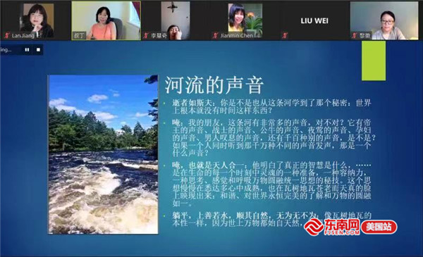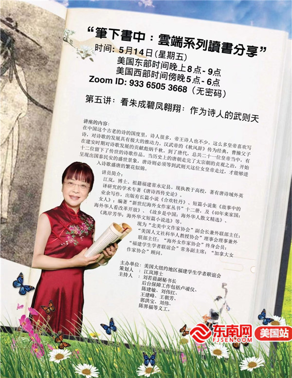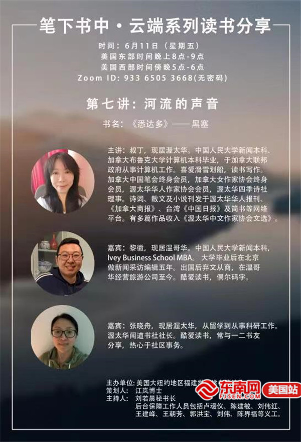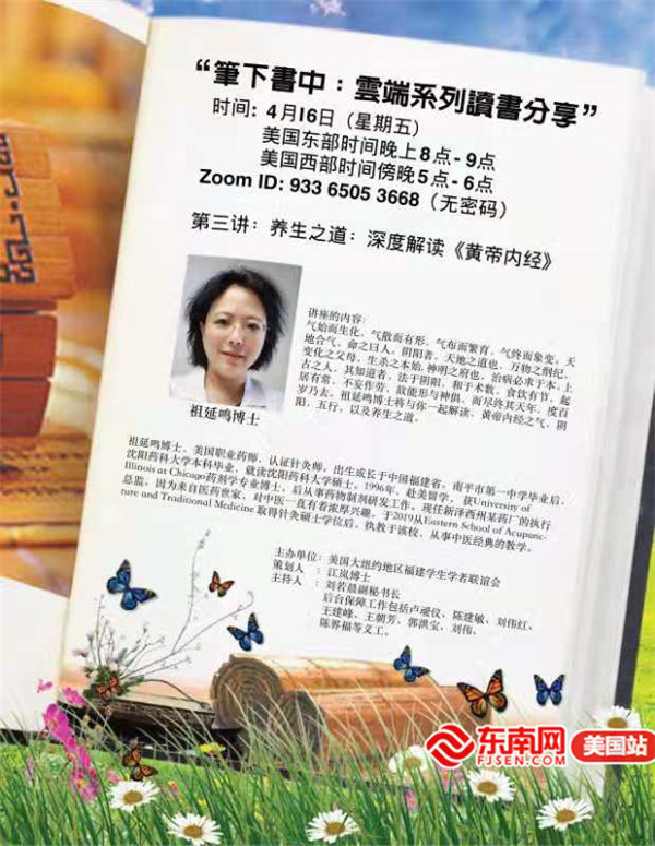 东南网美国6月17日讯(本网特约记者 刘伟)由美国大纽约地区福建学生学者联谊会主办的“云端读书分享”活动已成功举办七讲。活动由知名女作家江岚博士策划,来自罗格斯大学、联谊会副秘书长刘若晨同学,常务副主席陈建敏博士主持。