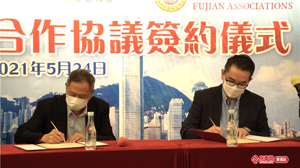 东南网香港5月24日讯(本网特约记者 李一杰 文/图)24日下午,香港福建社团联会与康盈医疗集团合作协议签约仪式在联会会所举行。香港福建社团联会主席吴换炎和康盈医疗副行政总裁兼顾问药剂师梁耀鸣代表双方在合作协议上签字。联会功能界别委员会常务副主任、秘书长邱诚隆主持签约仪式。
