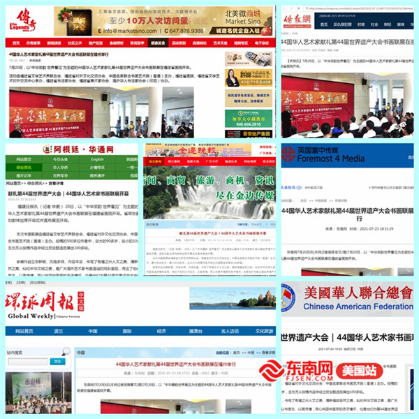 东南网8月10日讯(本网记者 吴隆重)由福建省文学艺术界联合会、福建省对外文化交流协会、中国名家联合书画艺术院(香港)主办的44国华人艺术家献礼第44届世界遗产大会书画联展于日前圆满落幕。记者从福建省文联获悉,此次展览活动受到了来自全球五大洲的20多家境外媒体推送、展示,相关报道阅读量突破6000万,网上观展不断升温,得到了全球华人艺术家、艺术爱好者的广泛关注,反响热烈。