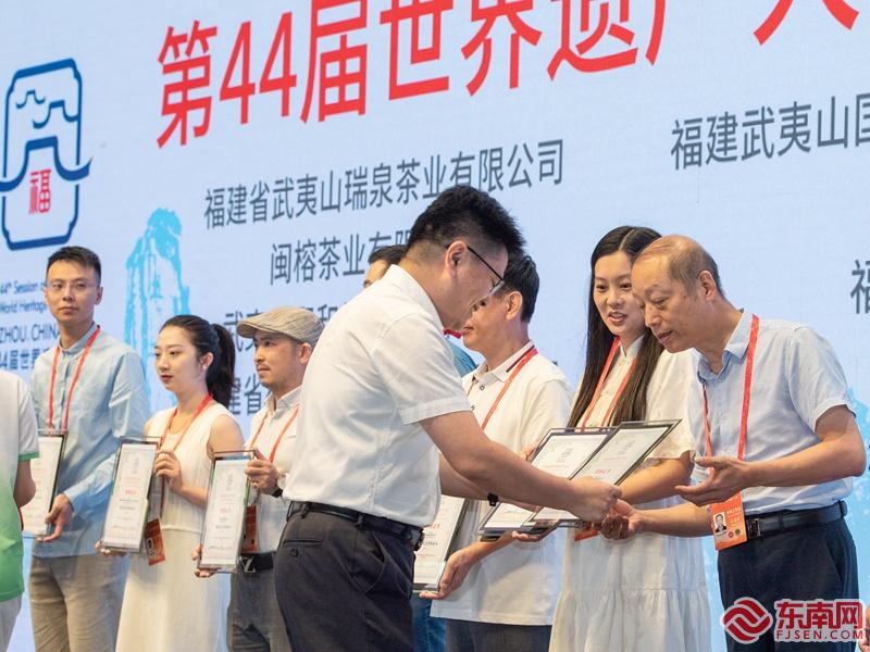 福州茉莉花茶窨制工艺非遗传承人、闽榕茶业董事长王德星(右一)获颁世遗大会“接待用茶赞助企业”证书 严锦华供图
