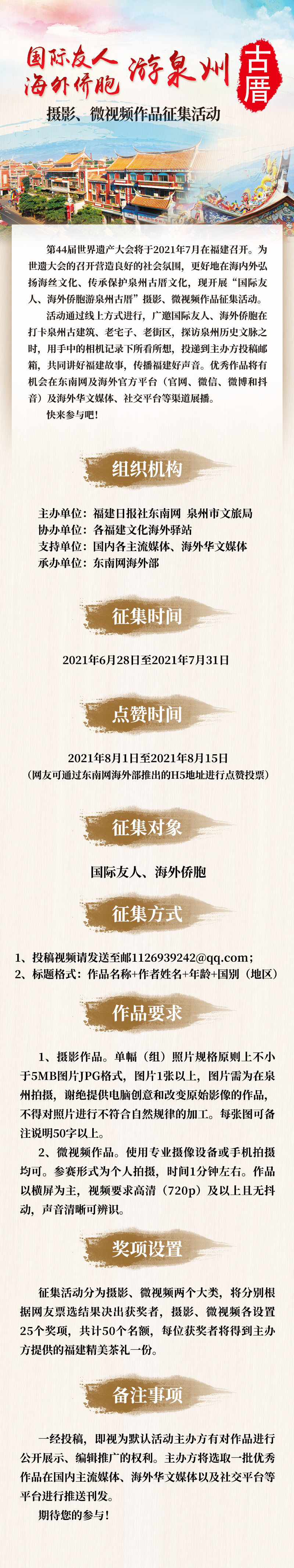 活动通过线上方式进行,征集时间为期一个月,广邀请国际友人、海外侨胞在打卡泉州景点、美食等,探访泉州历史文脉之时,用自己手中的相机记录所看所想,共同讲好福建故事,传播福建好声音。相关作品均可以“作品名称+作者姓名+年龄+国别(地区)”命名,并发送至投稿邮箱1126939242@qq.com。