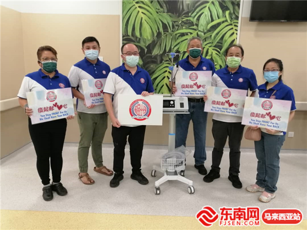 古晋巴达旺福州公会主席甲必丹拿督刘思乐(左三)、副主席林德勤(右三)、秘书林唐锦(右二)、妇女组主任朱缮霖(左一)、妇女组副主任刘亿(右一)及青年团副团长徐和成(左二)在向马来西亚砂拉越古晋中央医院移交该会献赠的呼吸机前合影。