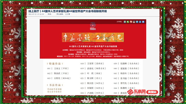 东南网8月10日讯(本网记者 吴隆重)由福建省文学艺术界联合会、福建省对外文化交流协会、中国名家联合书画艺术院(香港)主办的44国华人艺术家献礼第44届世界遗产大会书画联展于日前圆满落幕。记者从福建省文联获悉,此次展览活动受到了来自全球五大洲的20多家境外媒体推送、展示,相关报道阅读量突破6000万,网上观展不断升温,得到了全球华人艺术家、艺术爱好者的广泛关注,反响热烈。