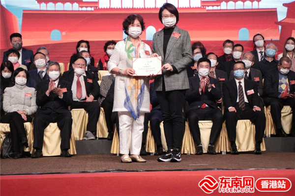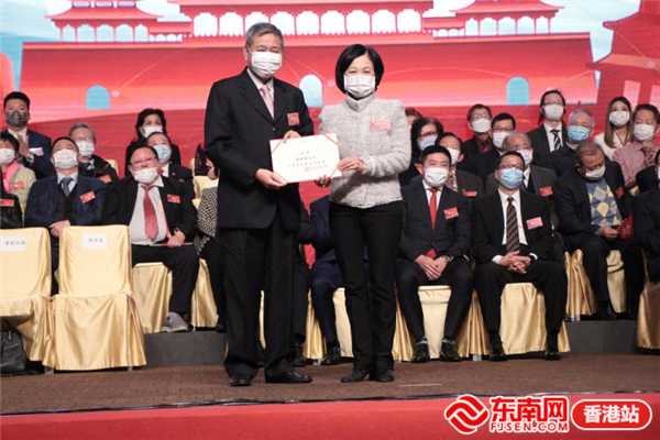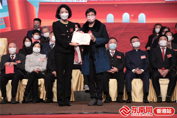 香港福建社团联会顾问蔡素玉向香港华侨华人总会永远荣誉会长李然颁发聘书。