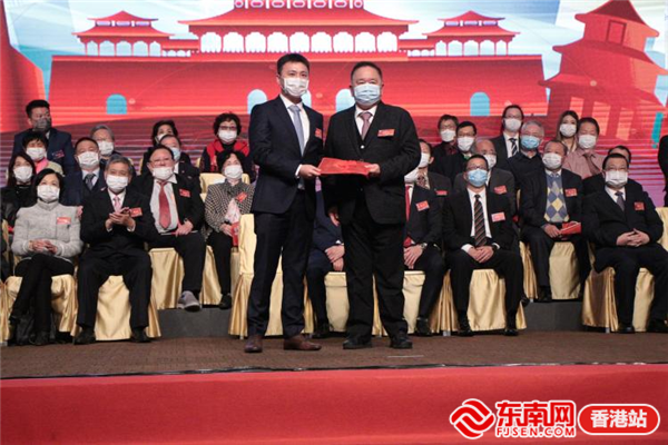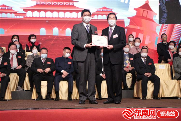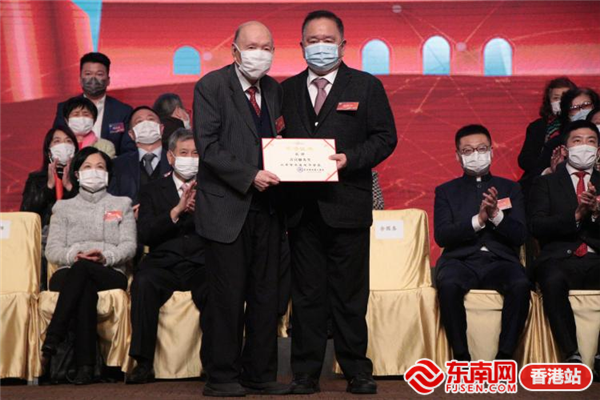 香港特区政府民政事务局副局长陈积志颁发香港华侨华人总会第九届理事证书,香港华侨华人总会会长陈昆代表全体理事接受证书。