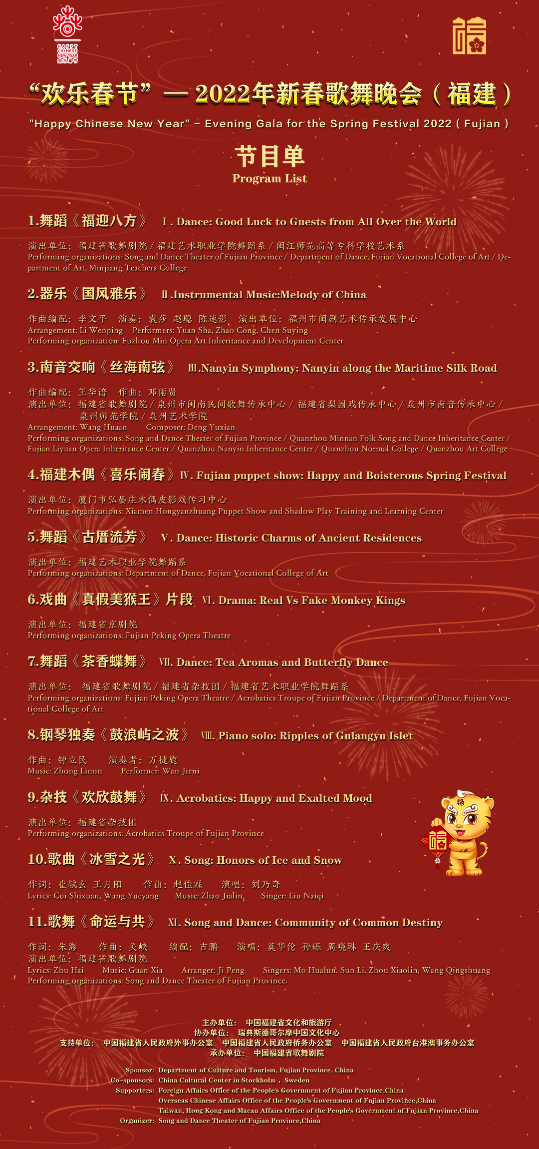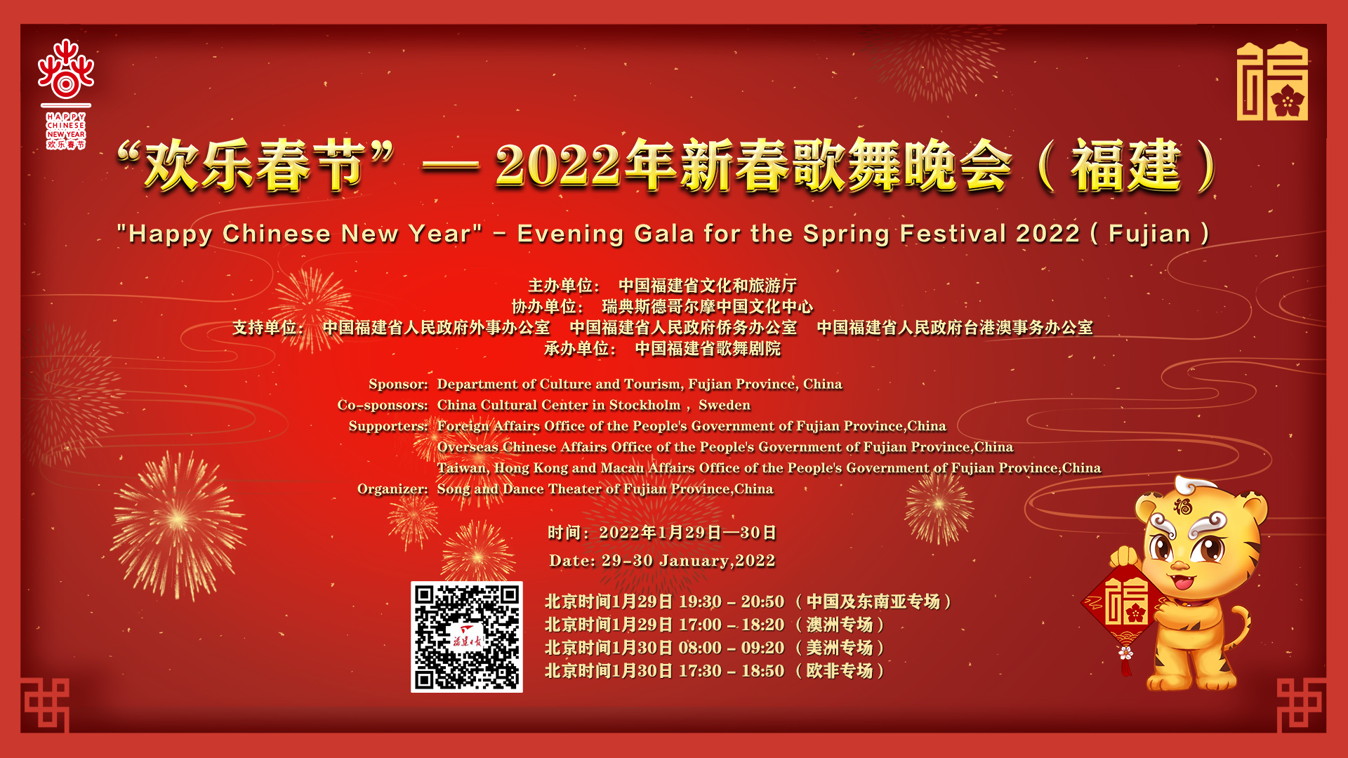 东南网1月24日讯(本网记者 王文青)为推动中华文化走出去,向世界阐释推介更多具有中国特色、体现中国精神、蕴藏中国智慧的优秀文化,增进与世界各国及地区的人文交流和民心相通,由福建省文化和旅游厅主办,瑞典斯德哥尔摩中国文化中心协办,福建省人民政府外事办公室、福建省人民政府侨务办公室、福建省人民政府台港澳事务办公室支持,福建省歌舞剧院承办的“欢乐春节”——2022年新春歌舞晚会(福建)将于2022年1月29日—30日进行网络播放。