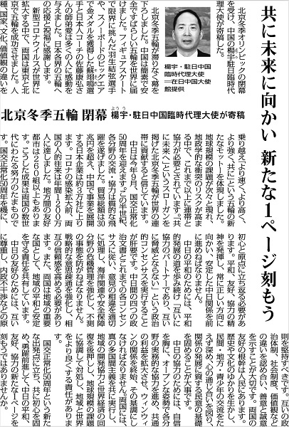 2022年2月23日,驻日本使馆临时代办杨宇在日本五大全国性报纸之一的《每日新闻》发表题为《一起向未来,共写新篇章》的署名文章,宣介北京冬奥会成功举办的积极意义,阐明对当前中日关系的看法主张,结合中日邦交正常化50周年重要节点,强调双方应落实两国领导人共识,回归初心和原点,发扬和平、友好、合作精神,推动中日关系沿着正确方向行稳致远。全文如下: