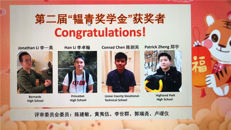 东南网美国3月9日讯(本网特约记者 刘伟)近日,经评审委员会仔细审阅和评估讨论,新泽西福建同乡会第二届“韫青奖学金”获奖名单隆重揭晓。他们分别是来自伯纳德高中的李一昊、普林斯顿高中的李卓翰、联合县职业技术学校的陈剑吴和高地公园高中的郑宇。