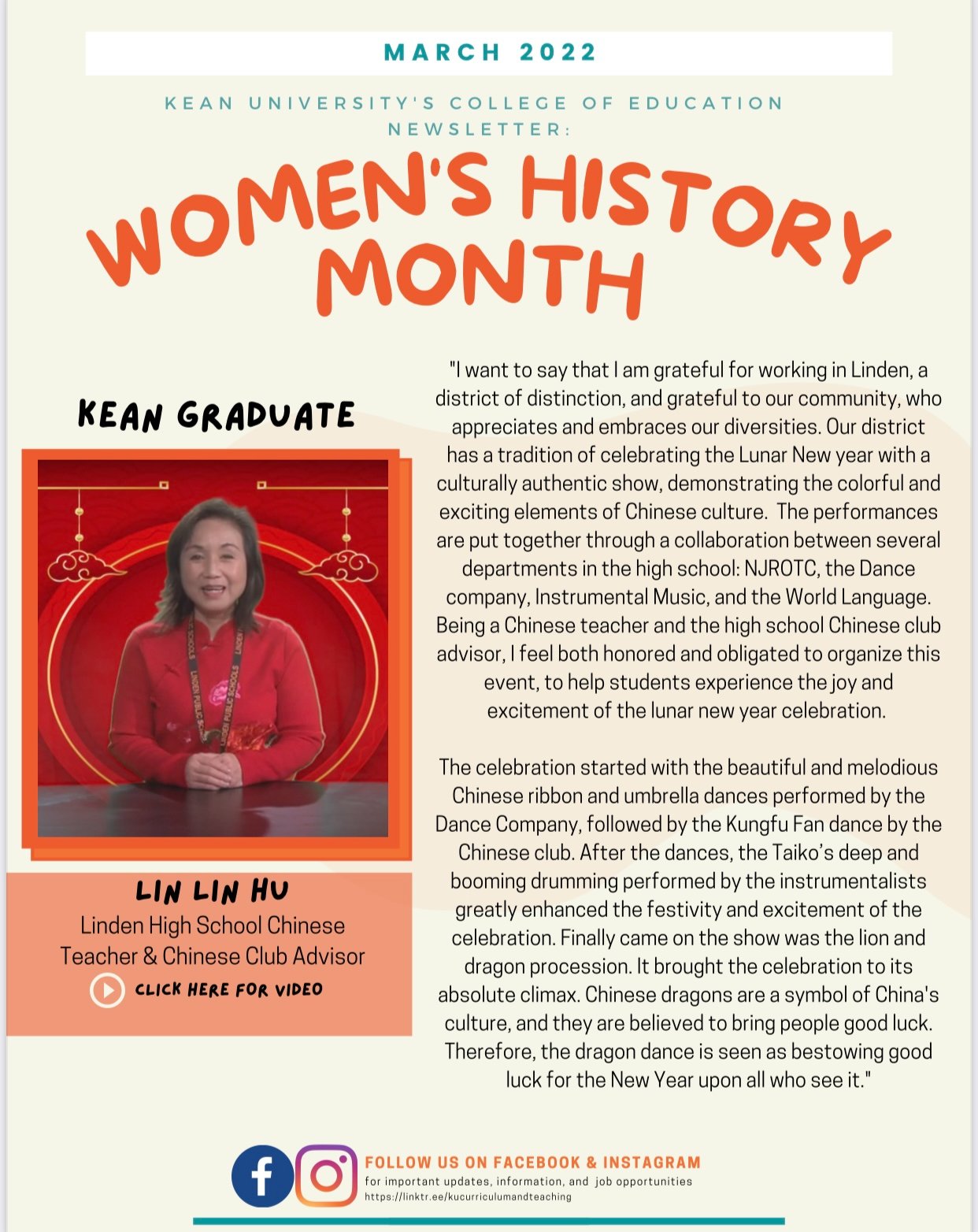 东南网美国3月16日(本网特约记者 刘伟)近日,由新泽西州立肯恩大学组织的三月“妇女月”专题报道对林登高中中文教师胡林林进行了专访,表彰她在推广多元文化、中文教育,帮助美国学生了解中国文化上所作的贡献。