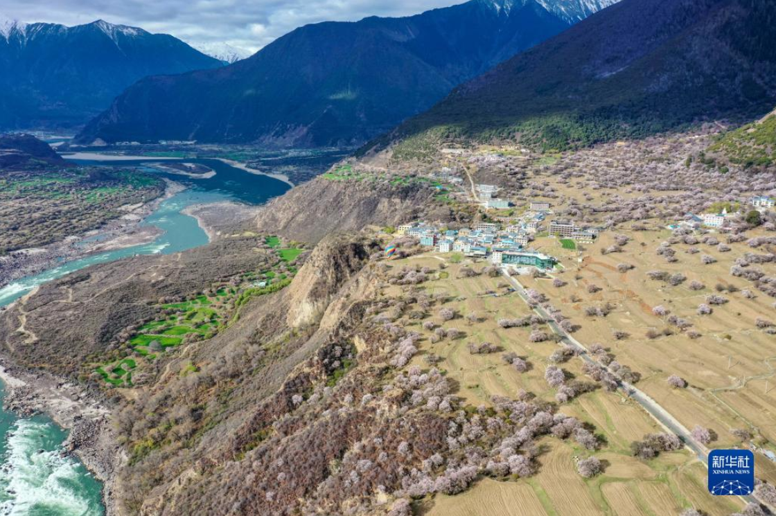 这是无人机拍摄的索松村,村子脚下是蜿蜒的雅鲁藏布江(4月13日摄)。