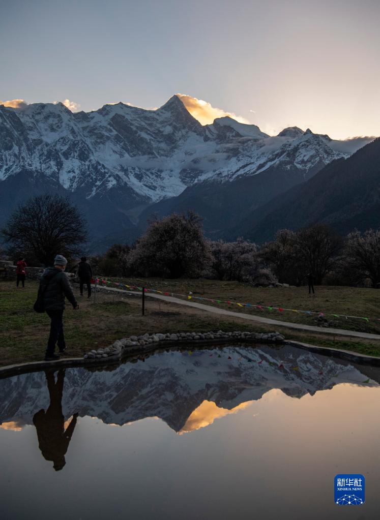 桃花掩映下的南迦巴瓦峰(4月13日摄)。
