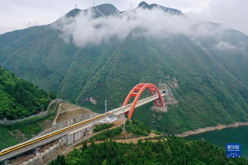 4月14日,检测车通过郑渝高铁大宁河特大桥(无人机照片)。