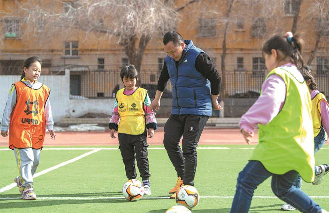 A soccer coach teaches a group of girls in Shawan city, Xinjiang Uygur autonomous region, with the aim of setting up a team for local youngsters. [HU HUHU/XINHUA]