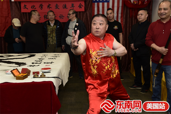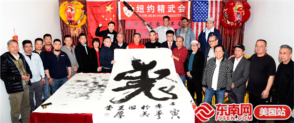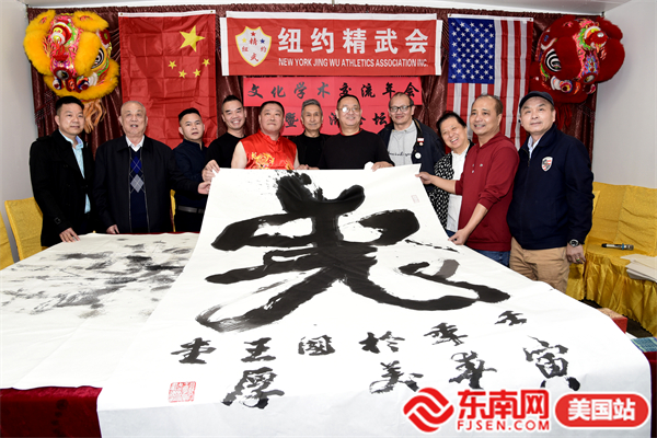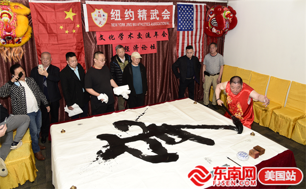 武术书法大师王厚堂在伍国标的介绍下登台,他已年近古稀,依然是童颜乌发、精神矍铄。但见他身着一身儒雅的中国传统绣金龙红衣上场,拿起巨大的毛笔写出一个虎虎生威的“虎”字,像老虎一样威武雄壮,有一种令人敬畏的气势,寓意精神、气势旺盛。现场响起了热烈的掌声,王厚堂向到场嘉宾表达了祝福。他在发言中谈到武术与书法的关系,书法中的“提按顿挫”如形意拳的 “起落钻翻”“中锋运笔”如太极拳的 “尾闾中正”“藏锋护尾”如大成拳的 “力不出尖”“捻杆转腕,无使节目孤露”如螳螂拳的“浑身似轴,受力则转”。他关于书法与武术的独到见解得到了与会人士的赞扬和肯定。王厚堂表示在海外弘扬国粹的路还很长,并祝愿纽约精武会继续发展壮大。