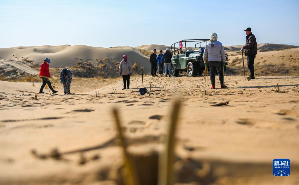 内蒙古自治区达拉特旗银肯塔拉生态旅游区地处库布其沙漠。近日,工人们来到沙漠中种树治沙,为沙漠增添绿色。