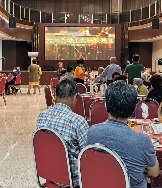 东南网4月26日讯(本网记者 孙紫腾)据新加坡福州会馆消息,4月23日晚,新加坡福州会馆在新加坡举办妈祖诞辰联欢晚宴,这是福州会馆自新冠疫情暴发后举办的首场庆祝晚宴。此前,福州会馆的妈祖诞辰联欢晚宴已停办两年,福州会馆是在妈祖诞辰日两周前,根据当地防疫政策决定恢复举办联欢晚宴。