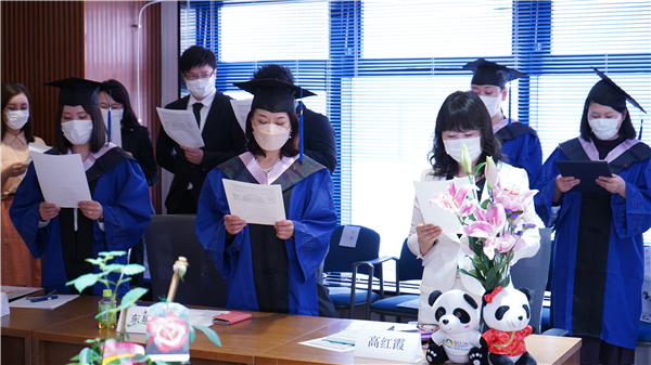 暨南大学日本学院管理委员会委员、千代田教育集团会长、博士栗田秀子(右一)颁发毕业证书(暨南大学日本学院供图)