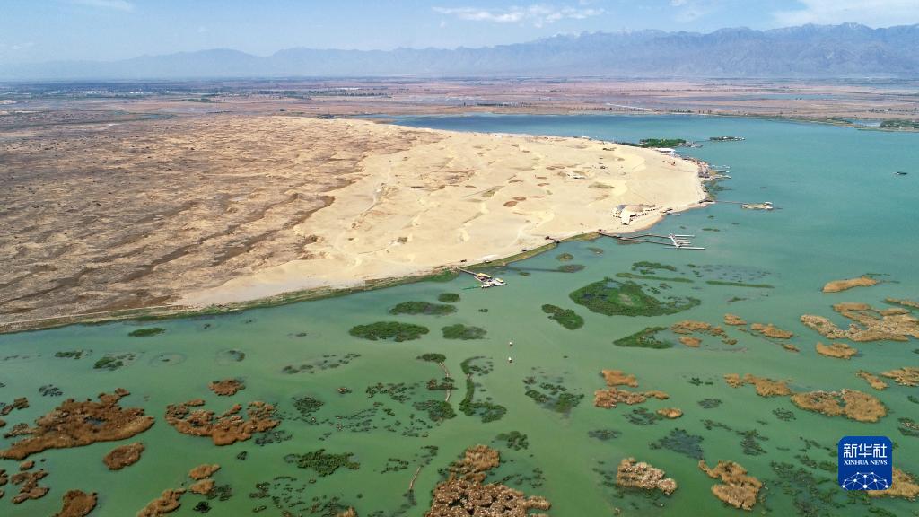 半沙半水的沙湖景区(无人机照片,新华社记者 王鹏 4月30日摄)。