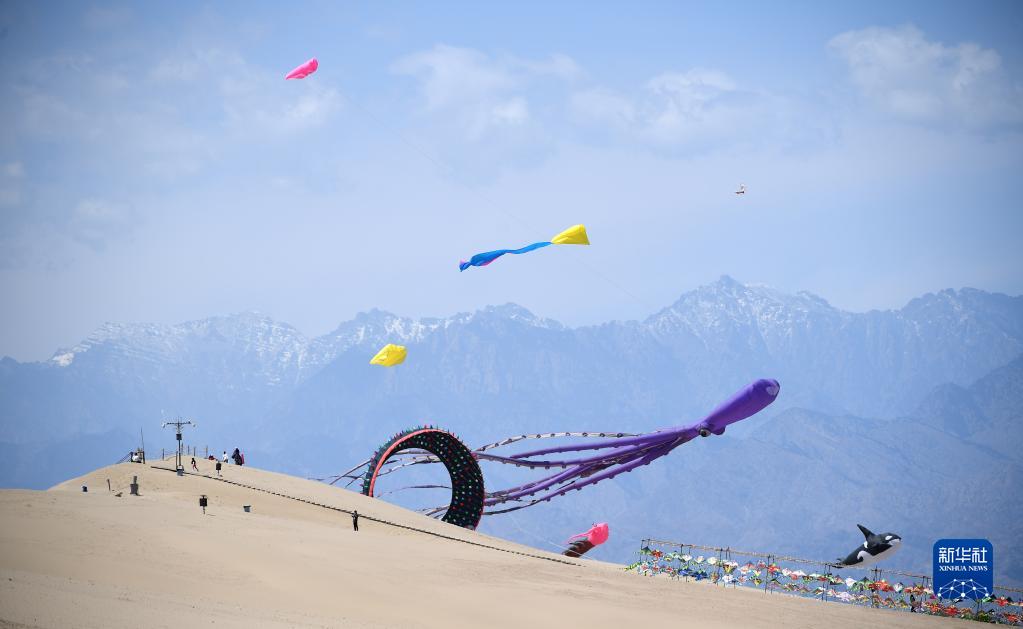 来自山东潍坊的风筝团队为游客献上沙漠大型风筝放飞表演(4月30日摄)。新华社记者 王鹏 摄