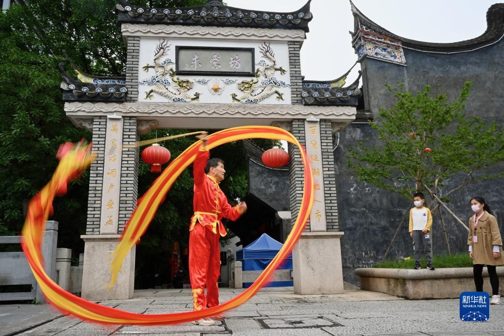 On May 2nd, an art talent is performing one-handed Dancing Dragon in the historic cultural area of Zhuzi Lane in Fuzhou. (photo by Jiang Kehong)