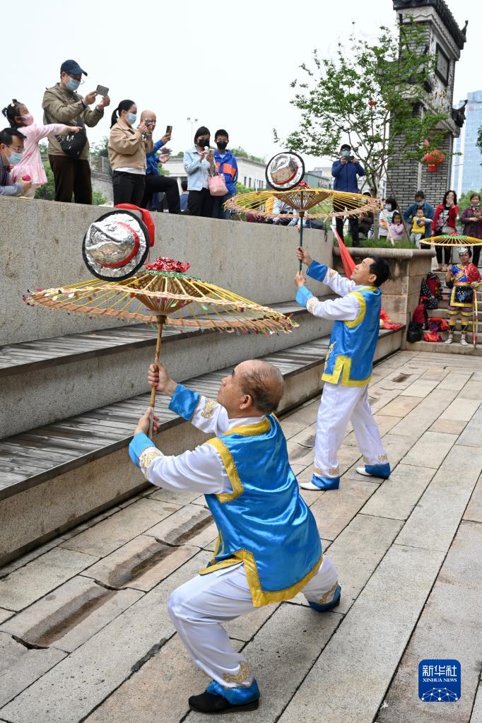 On May 2nd, the team of Colorful Umbrella Performing Art Troupe is performing the skills in the historic cultural district of Zhuzi Lane in Fuzhou. (photo by Jiang Kehong)