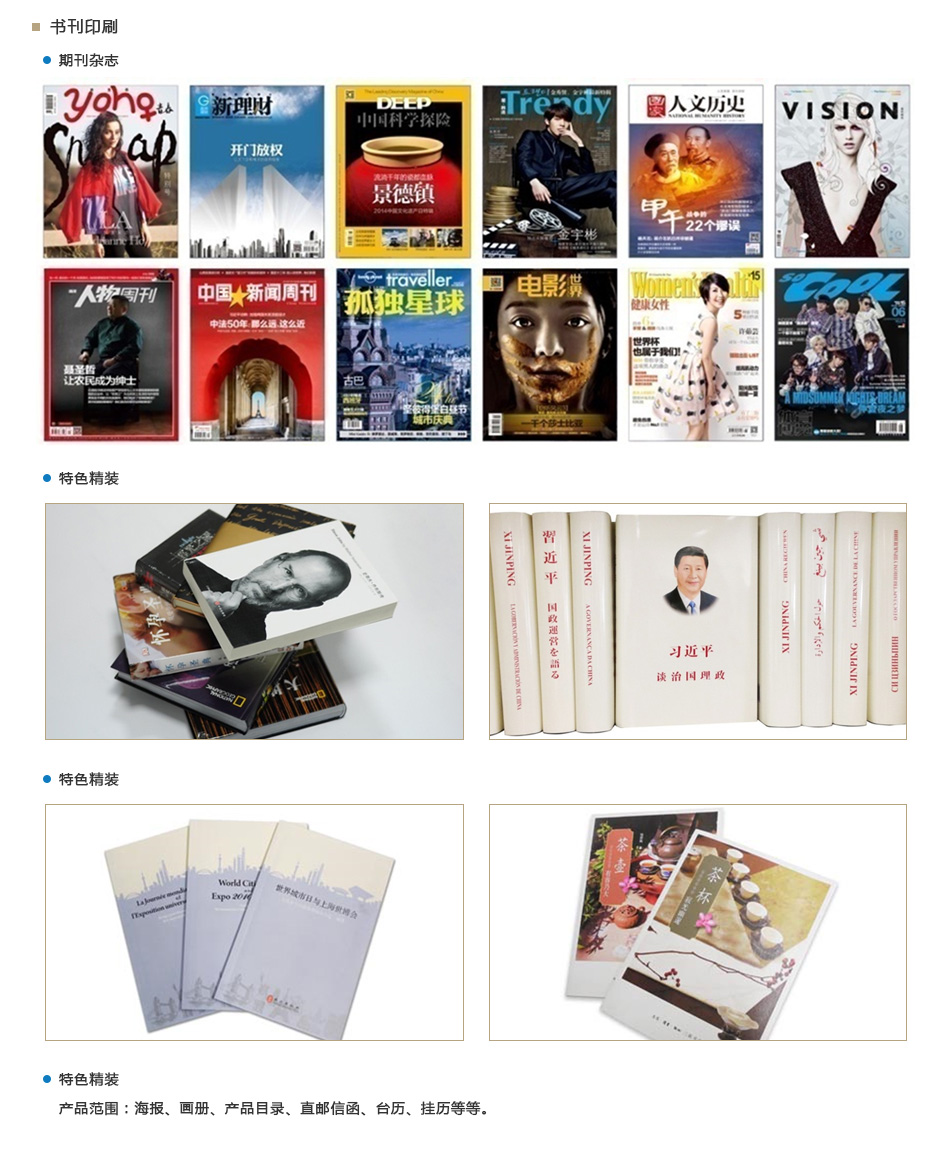 主要产品有精品画册、图书、杂志、海报等。