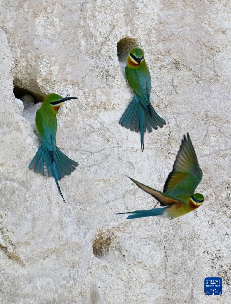Three Blue-tailed Bee-eaters are ready to build nests on the earth wall. Photo by Xinhua reporter Wei Peiquan