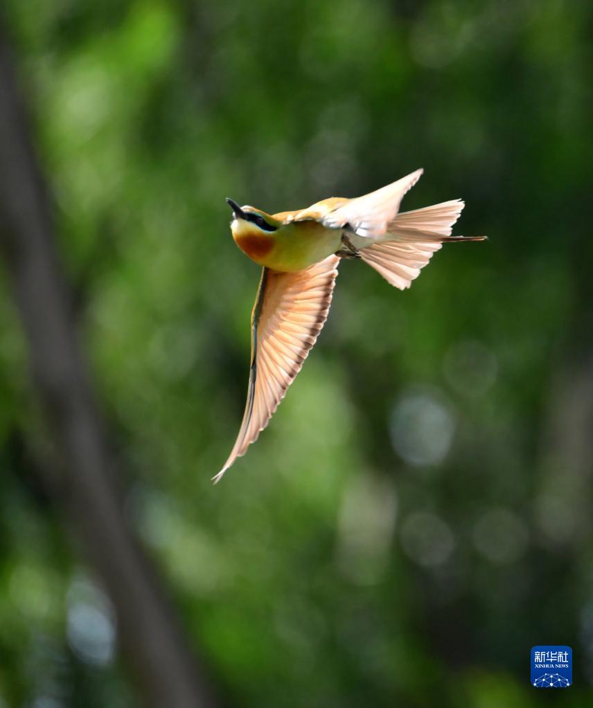 A Blue-tailed Bee-eater is hunting on May 3rd. Photo by Xinhua reporter Wei Peiquan