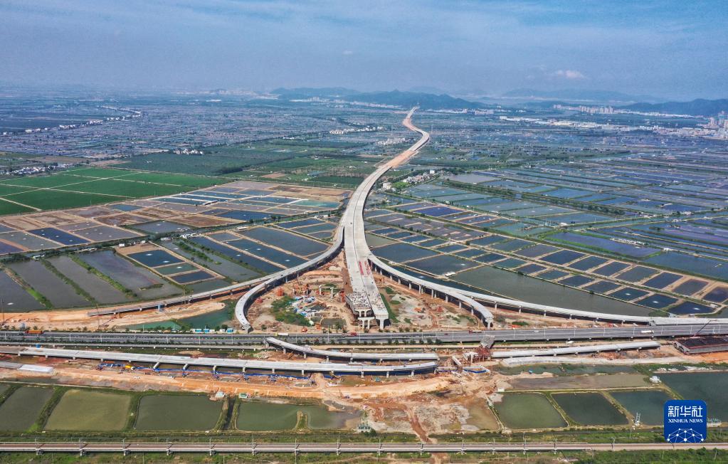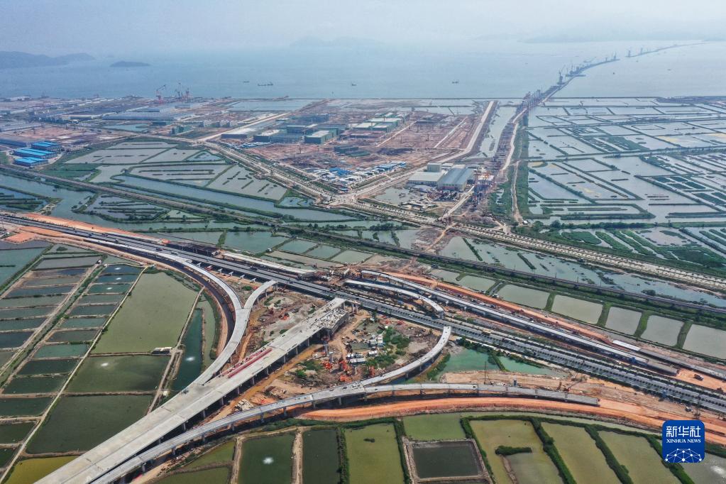 5月5日拍摄的珠海鹤港高速公路二期工程高栏港枢纽立交桥建设现场(无人机照片)。新华社记者 刘大伟 摄