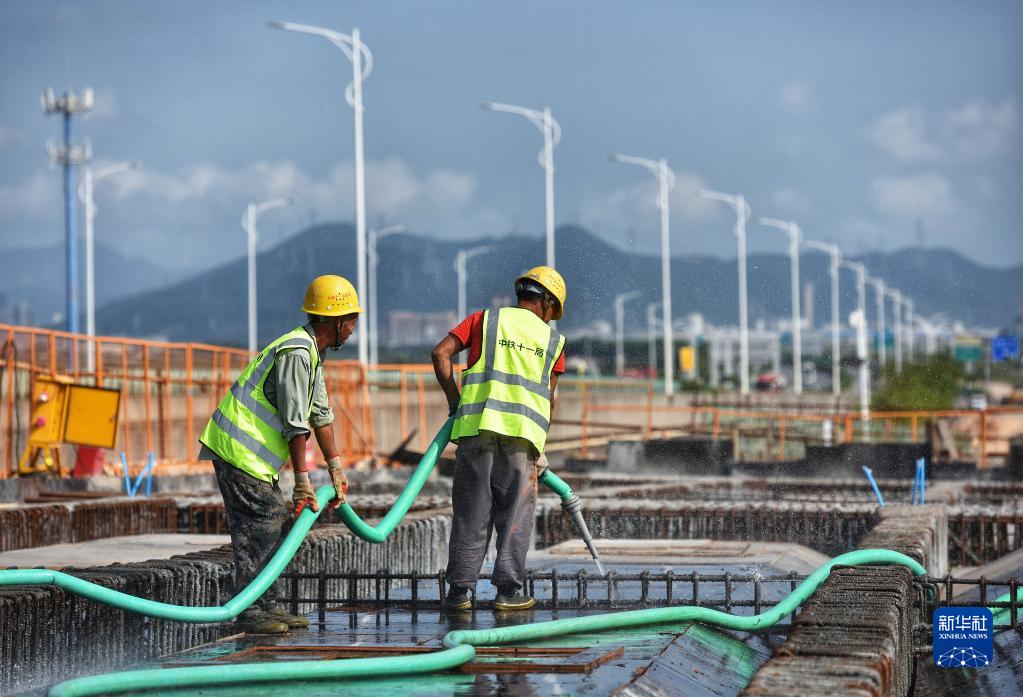 5月5日,工人在珠海鹤港高速公路二期工程高栏港枢纽立交桥清洗模板底板。新华社记者 刘大伟 摄