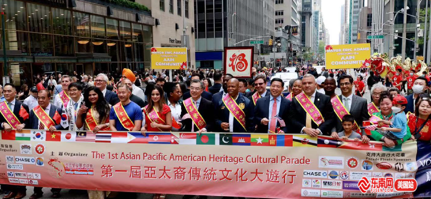 东南网美国5月 17日讯(本网特约记者 文/图 白水 特约通讯员 郑快乐)当地时间5月15日,纽约首届“亚太裔传统文化大游行”在曼哈顿中城第六大道隆重举行。中国驻纽约总领事黄屏出席并致辞,吴晓明副总领事陪同。美国参议院多数党领袖舒默,联邦众议员孟昭文、维乐贵兹,前交通部长赵小兰,纽约州参议员刘醇逸、州众议员牛毓琳、纽约市长亚当斯、市议员黄敏仪等出席。纽约州州长霍楚派代表向活动颁发了褒扬状。