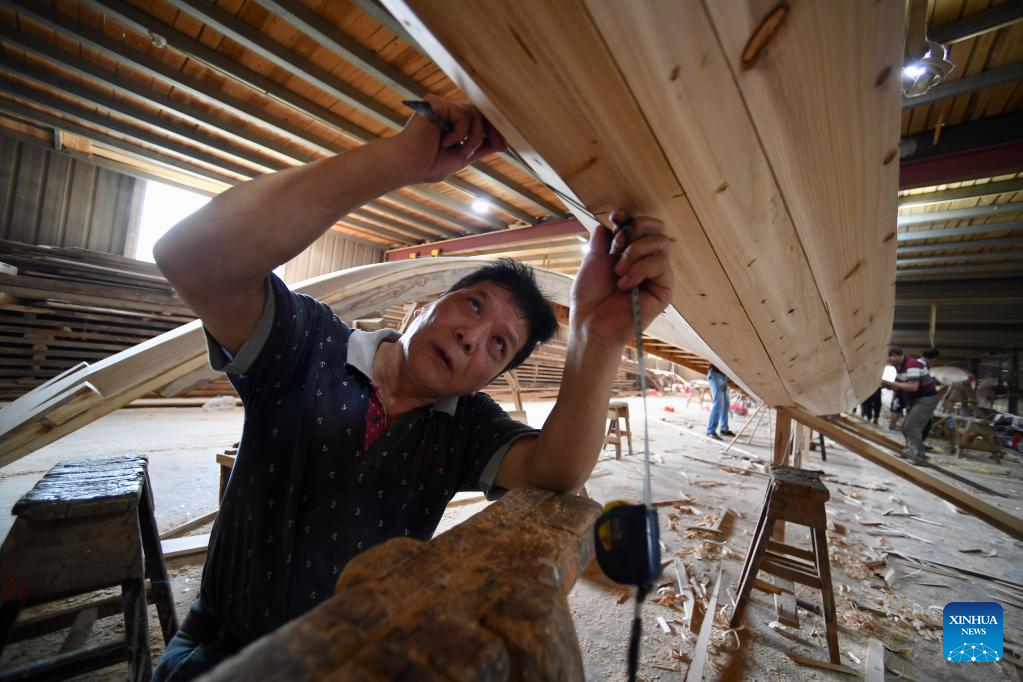 A craftsman measures a dragon boat at Fangzhongxiong dragon boat factory in Fangzhuang Village of Nantong Township in Minhou County of Fuzhou, southeast China's Fujian Province, May 30, 2022. (Xinhua/Jiang Kehong)