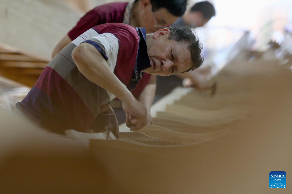 Craftsmen build dragon boats at Fangzhongxiong dragon boat factory in Fangzhuang Village of Nantong Township in Minhou County of Fuzhou, southeast China's Fujian Province, May 30, 2022.(Xinhua/Jiang Kehong)
