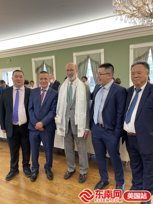 (From the left to the right in the photo)Liu Derong, Lu Wenbin, Pennsylvania Governor Tom Wolf, Lu Minke, Zhu Feng.(Photo by FJSN special correspondent Lin Yingzhang)