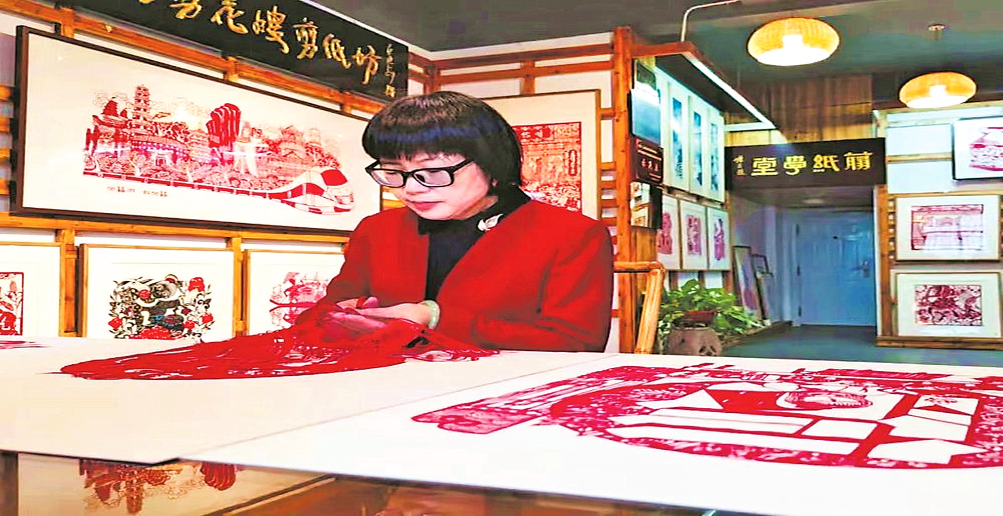 Zhou Dongmei, Master of Arts and Crafts in Fujian Province, is working on  Paper Cutting works. (Photo by Qiu Chunjing)