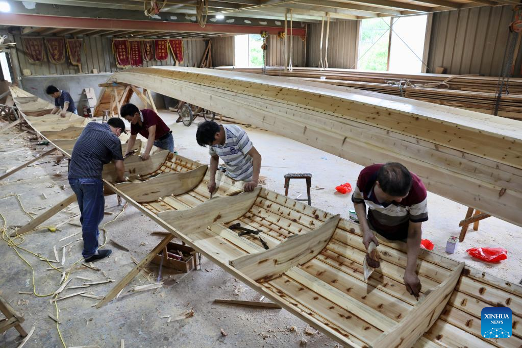 Fangzhuang, known as "Dragon Boat Village", has a traditional dragon boat manufacturing history for more than 700 years. Every year, more than 200 hand-made wooden boats, carefully built by craftsmen, are sold nationwide and even overseas from the village. (Xinhua/Jiang Kehong)