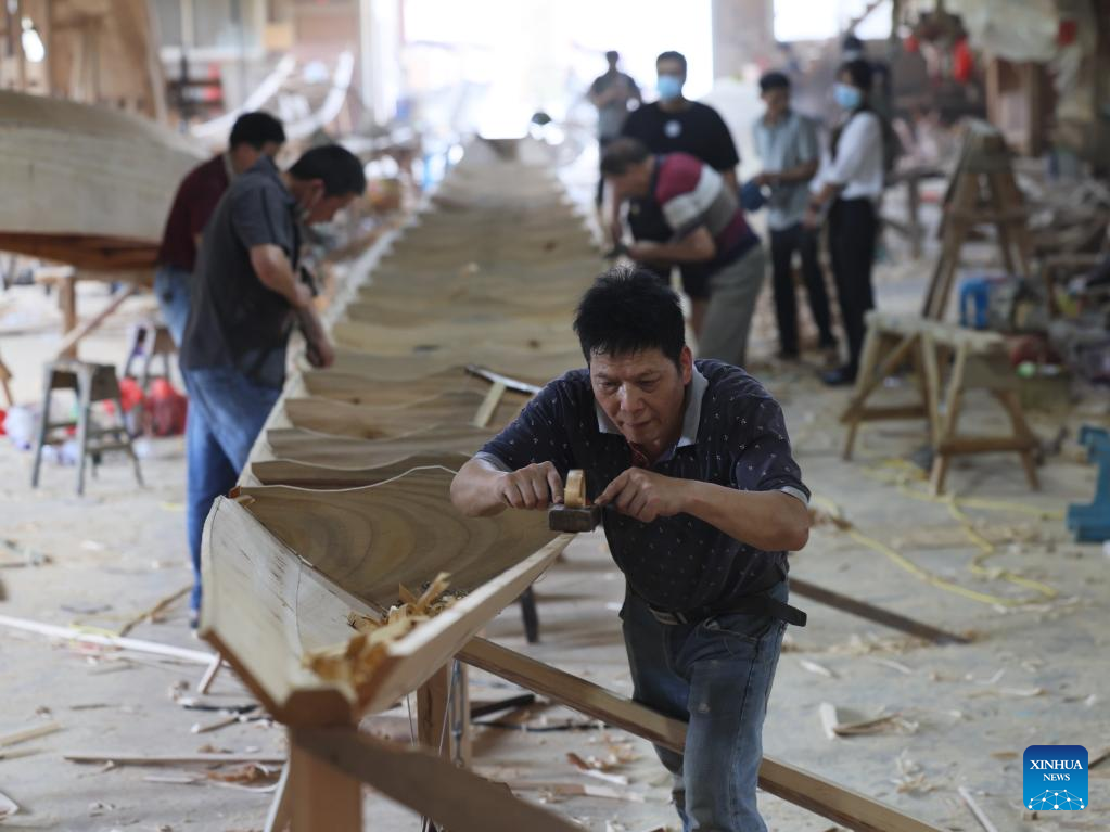 A craftsman builds a dragon boat at Fangzhongxiong dragon boat factory in Fangzhuang Village of Nantong Township in Minhou County of Fuzhou, southeast China's Fujian Province, May 30, 2022. (Xinhua/Jiang Kehong)