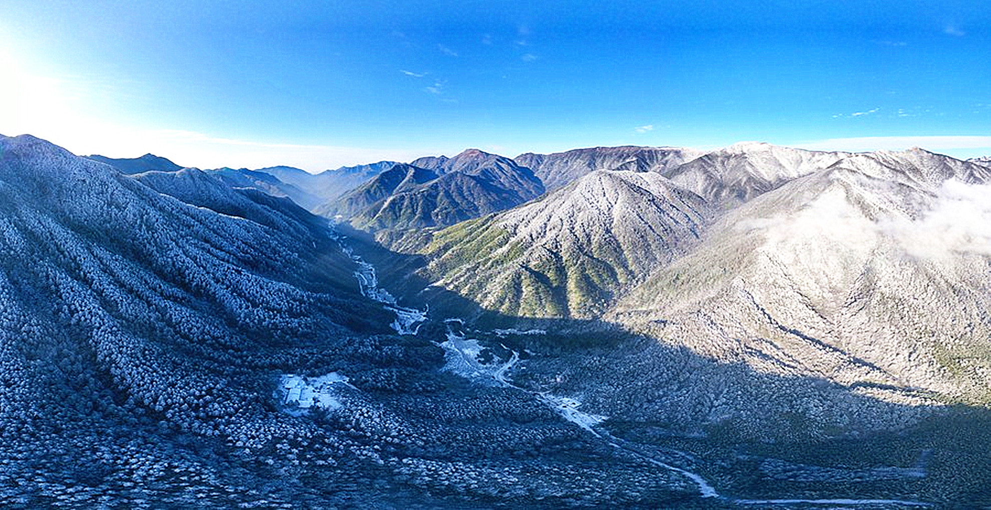 Aerial photo taken on Jan. 8, 2021 shows the snowy scenery of Mount Wuyi in southeast China's Fujian Province. (Xinhua/Jiang Kehong)