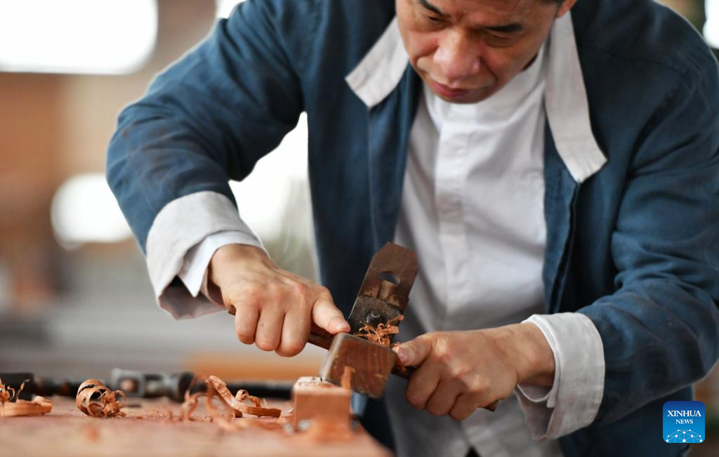 Chen Yushu planes the wood smooth in Putian, southeast China's Fujian Province, June 10, 2022.(Xinhua/Wei Peiquan)