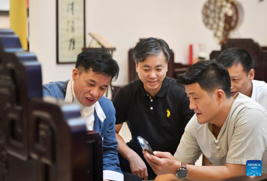 Chen Yushu (1st) has a talk about the classical furniture craftsmanship with provincial-level woodcarving inheritors in Putian, southeast China's Fujian Province, June 10, 2022.