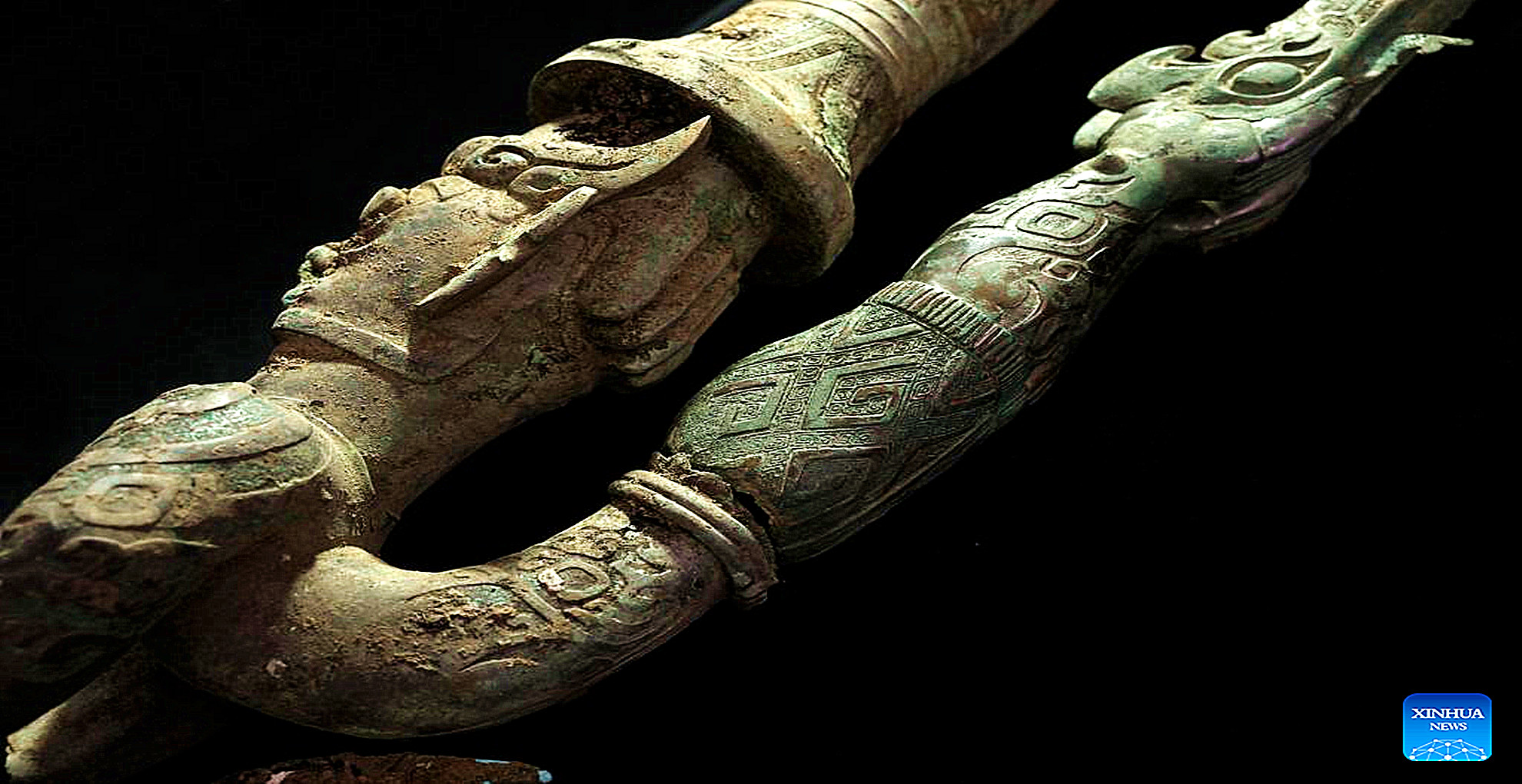 Photo taken on June 15, 2022 shows part of a successfully matched bronze sculpture that depicts a human-head, snake-body, and bird-claw figure, in southwest China's Sichuan Province. (Photo by Lu Haizi/Xinhua)