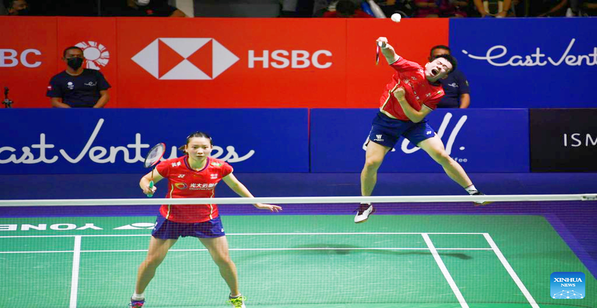 Zheng Siwei (R)/Huang Yaqiong of China compete during the mixed doubles final match against Watanabe Yuta/Higashino Arisa of Japan at Indonesia Open 2022 in Jakarta, Indonesia, June 19, 2022. (Xinhua/Xu Qin)