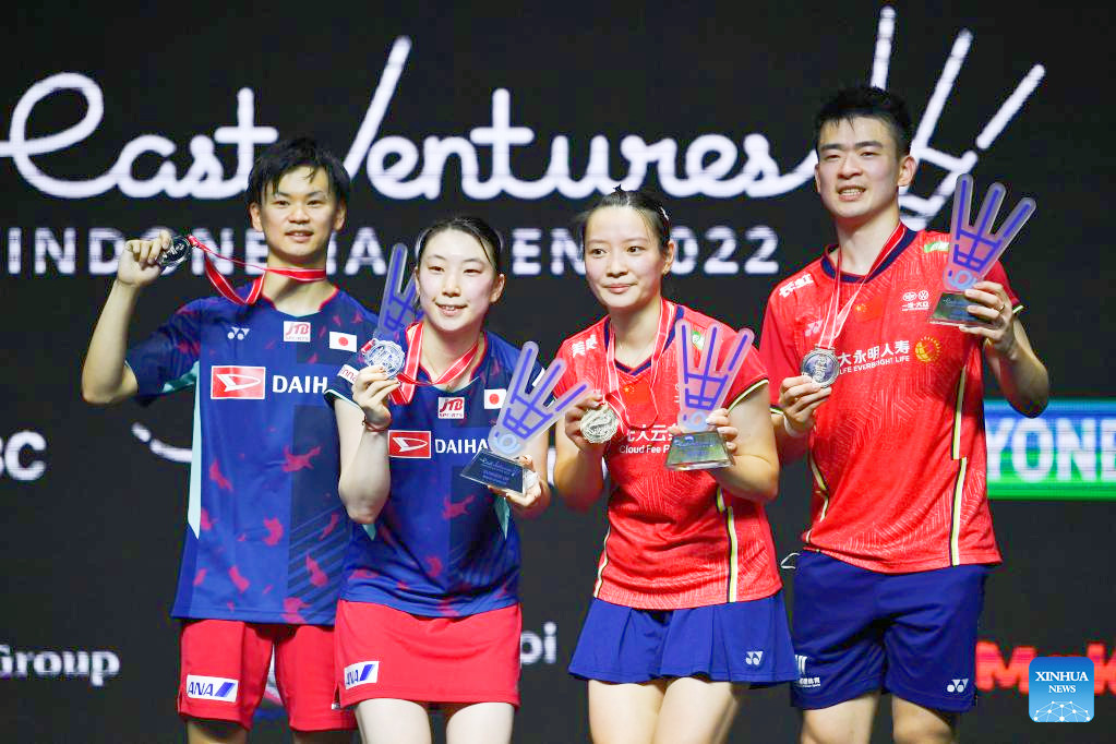 Zheng Siwei (1st R)/Huang Yaqiong (2nd R) of China and Watanabe Yuta (1st L)/Higashino Arisa of Japan pose for photos during the awarding ceremony for the mixed doubles event at Indonesia Open 2022 in Jakarta, Indonesia, June 19, 2022. (Xinhua/Xu Qin)