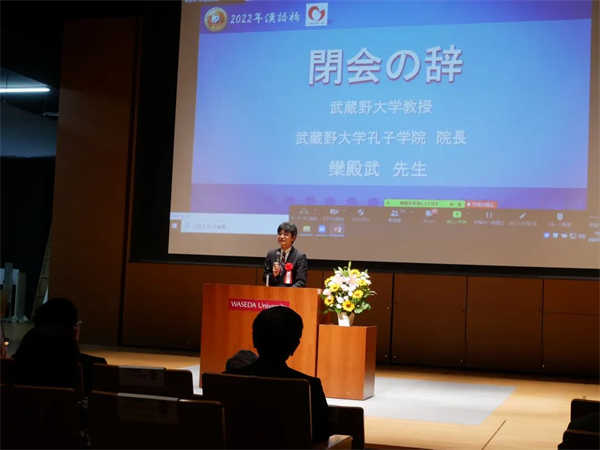 比赛组委会负责人,武藏野大学教授、孔子学院日方院长栾殿武致闭幕词(日本华人教授会 供图)