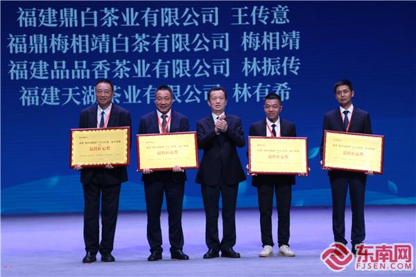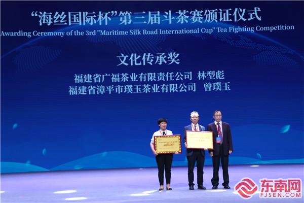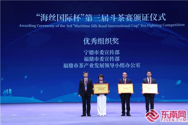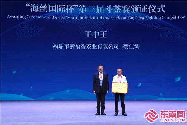 当天,现场举行“福”文化及“福茶”海外宣传员聘请仪式。美中茶文化交流协会会长朱立业、英国福建社团联合总会主席李光喜、日本总商会会长原田优美、澳中茶文化交流促进联合总会会长吴雷蒙、新中茶文化交流促进联合总会会长陈镁燕、意大利Ru Project文化交流协会副会长孔令娴、阿根廷和平统一促进会副会长刘伟、西班牙茶文化协会常务副会长王先金受聘为“福茶”海外宣传员。现场为“海丝国际杯”第三届斗茶赛(春季茶类)获奖单位、茶企颁发牌匾,向国家级和省级非遗传承人颁发“最佳匠心奖”“文化传承奖”,并向积极参与茶样征集及选送单位授予“优秀组织奖”荣誉。福建瑞达茶业有限公司、福建四季盛茶业有限公司、福鼎国号茶业有限公司选送的茶样获得“茶王”。 获得“王中王”的是福鼎市满福香茶业有限公司。