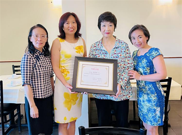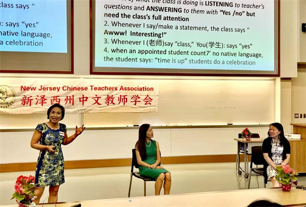 东南网美国6月29日讯(本网特约记者 刘伟)当地时间6月25日,新泽西州中文教师学会(以下简称“学会”)在蒙特克莱尔大学举办了主题为“相见和反思(Meet and Reflect)”的首届教学研讨会。来自新泽西州公立和私立大、中、小学以及周末中文学校的五十多位中文教师参加了本次活动,面对面畅谈交流。研讨会后,学会主要领导前往新泽西华人联合总会主席林洁辉家中,将学会荣誉会长的聘书送到林洁辉手上。