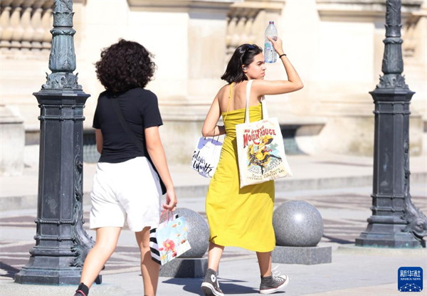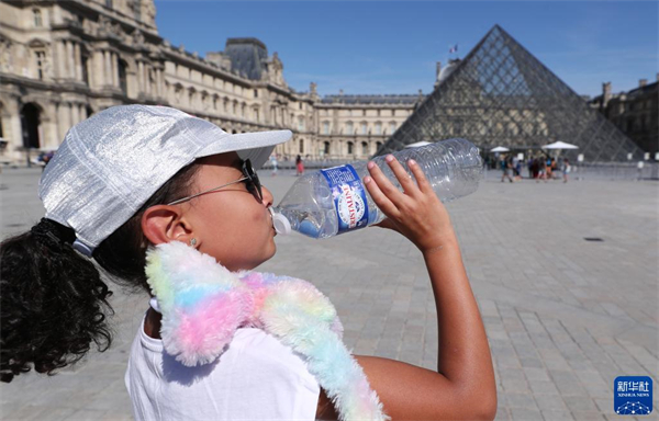 7月13日,女孩在法国巴黎卢浮宫博物馆玻璃金字塔广场上喝水解暑。