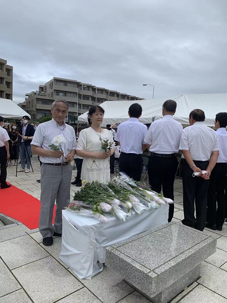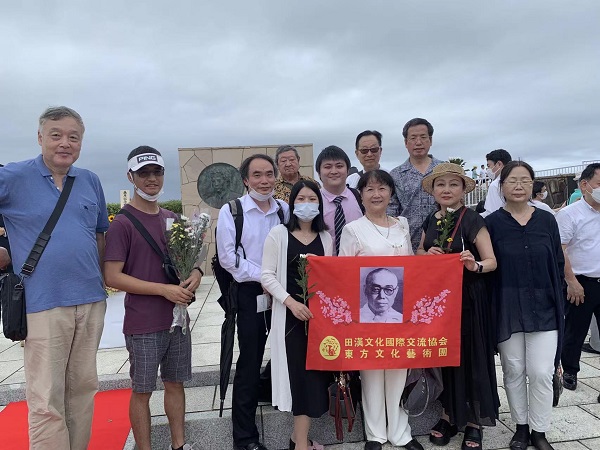 田伟和丈夫李明晓向聂耳纪念碑献花(日本NPO法人田汉文化交流会供图)