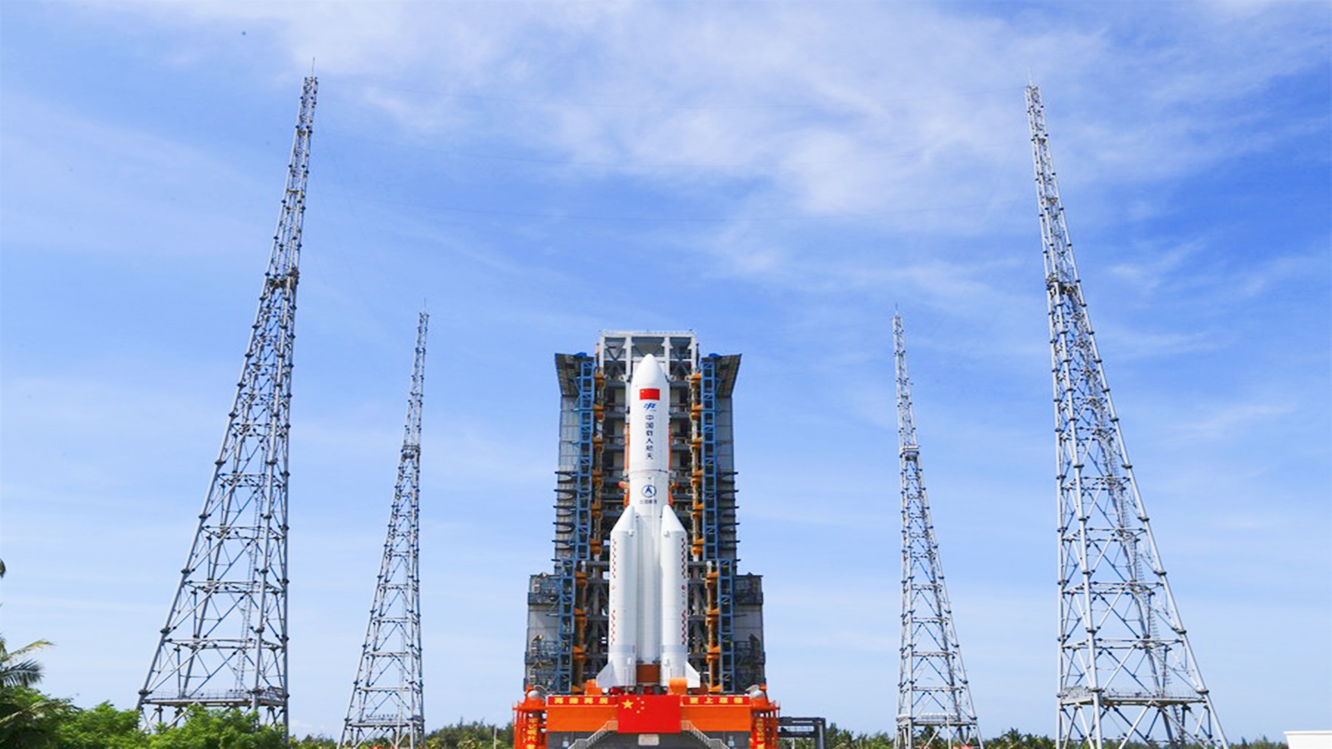 Photo taken on July 18, 2022 shows the combination of China's space station lab module Wentian and a Long March-5B Y3 carrier rocket being transferred to the launch area in south China's Hainan Province. (Photo by Tu Haichao/Xinhua)