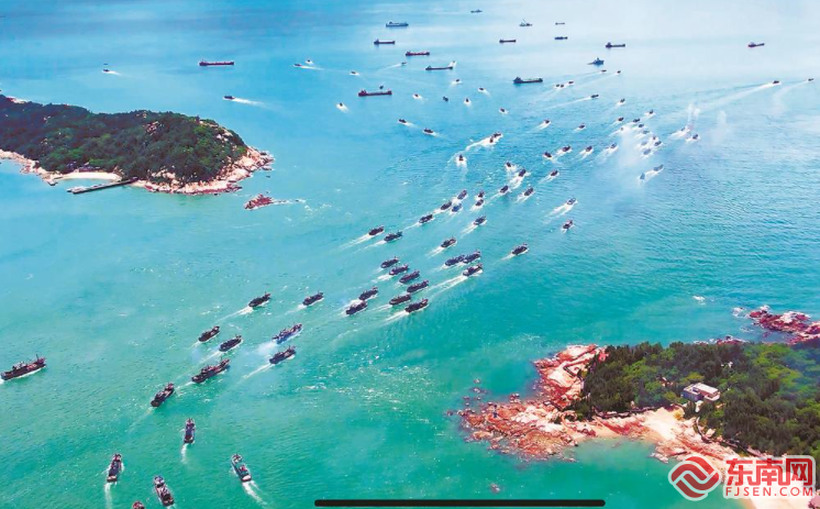 16日上午,2022莆田秀屿·南日岛开海节暨渔旅项目签约仪式在南日镇浮叶码头举行。中午12时,随着礼炮声响,数十艘渔船竞发离港。数百人共同见证盛况,祈盼开渔丰收。